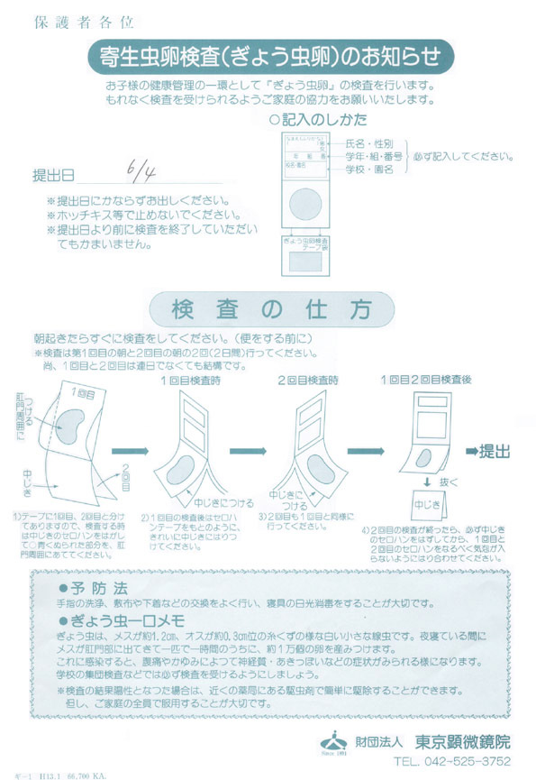 Also in June, the government sponsored worm test is handed out and parents collect a stool sample at home. The second test just calls for a pressure imprint around the child's anus two mornings in a row (this is where some worms lay their minuscule eggs). Return must be punctual since all the samples are collected only one time to be taken to the lab. A week or so later parents receive the results.